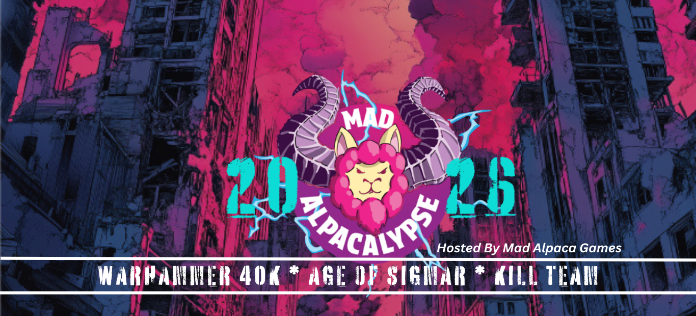 Join us December 12th and 13th at the Dixon Fairgrounds located in Dixon, CA for the 2nd Annual Mad Alpacalypse hosted by Mad Alpaca Games. In this event you will experience the excitement of competitive gaming while keeping the camaraderie and friendly rivalry. Now is the time to join us for Mad Alpacalypse where each roll of the dice or calculated move can swing the game in unexpected directions. Includes a 40K Major (124 player cap), Two-Day Age of Sigmar tournament (32 player cap), and Two-Day Kill Team Tournament (40 player cap). Mad Alpacalypse is not just a competition but a memorable gathering for our tabletop community.